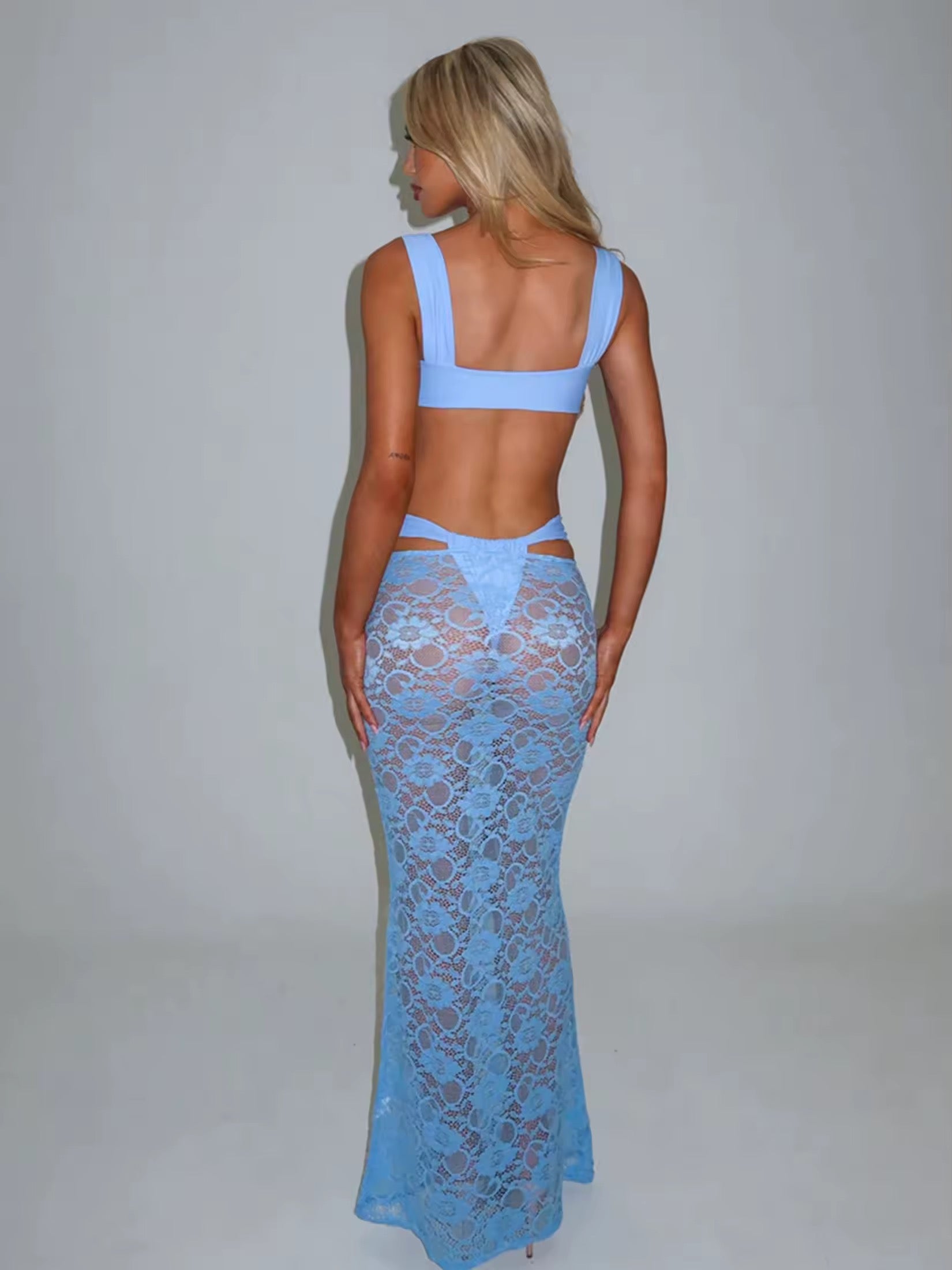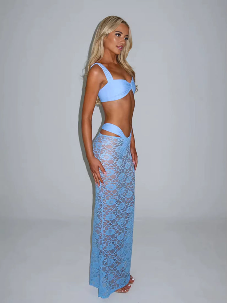 Dive into summer with the Blue Lagoon 3 Piece Bikini Set, featuring a stunning ocean blue hue that captures the essence of the sea. This set includes a flattering bikini top, matching bottoms, and a delicate lace coverup skirt, offering both style and versatility. Perfect for beach days or poolside lounging, it combines comfort with a touch of elegance to make you feel confident and radiant wherever you go. Embrace effortless beauty and make waves in this must-have swimwear trio.