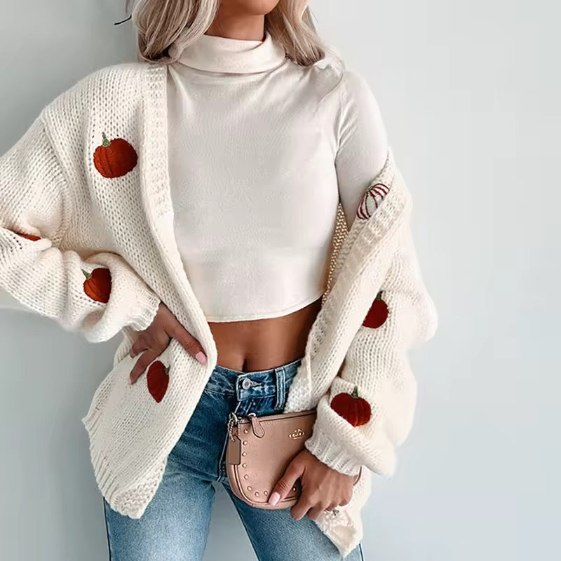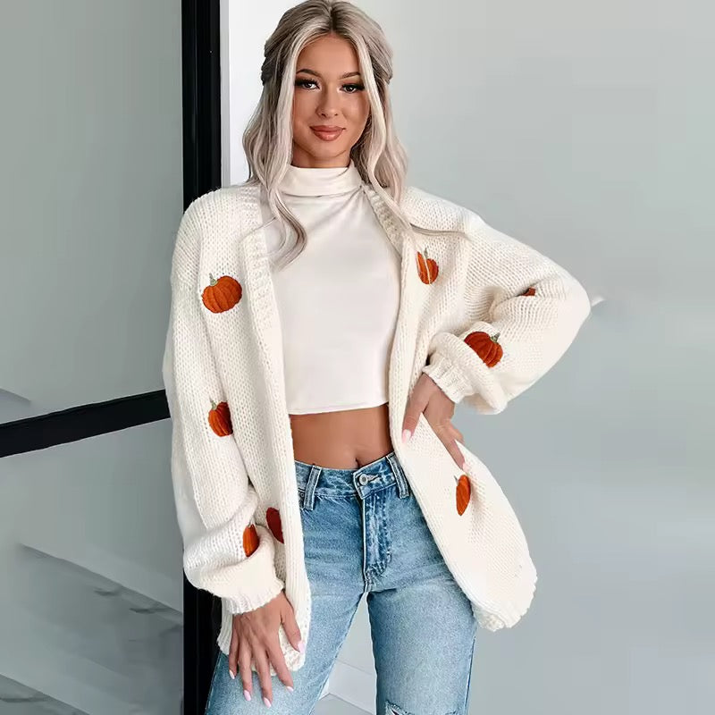 Celebrate the cozy charm of autumn with the Pumpkin Season Cardigan. Featuring an adorable pumpkin design, this cardigan adds a festive touch to your fall wardrobe while keeping you comfortably warm. Perfect for layering on crisp days, it combines style and seasonal spirit effortlessly. Embrace pumpkin season in comfort and cuteness!