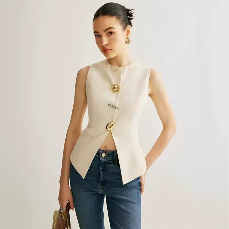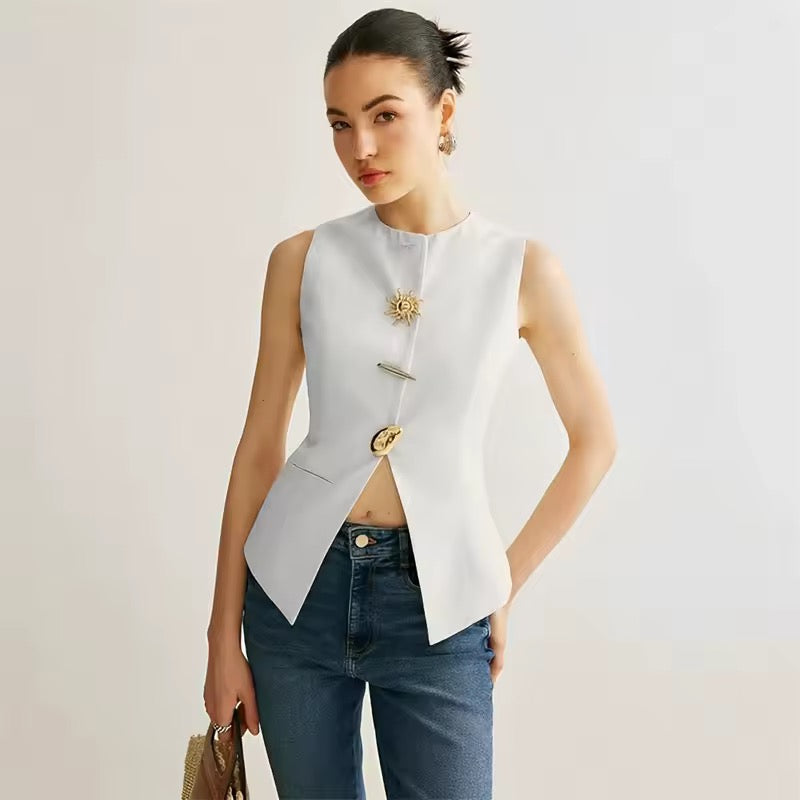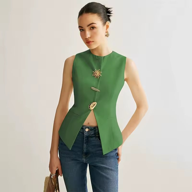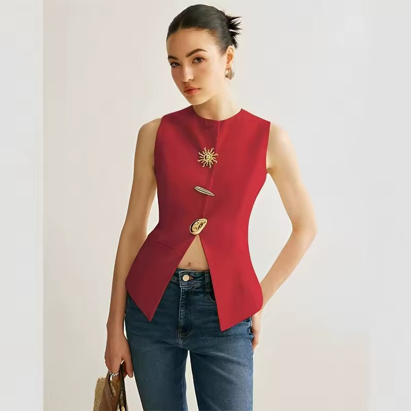 Elevate your style with our Waistcoat Buckle Top, featuring charming decorative buckles that add a distinctive touch to this versatile piece. The structured silhouette flatters your figure while the unique design transitions effortlessly from office to evening. Don't settle for ordinary—make a statement with this must-have addition to your wardrobe.