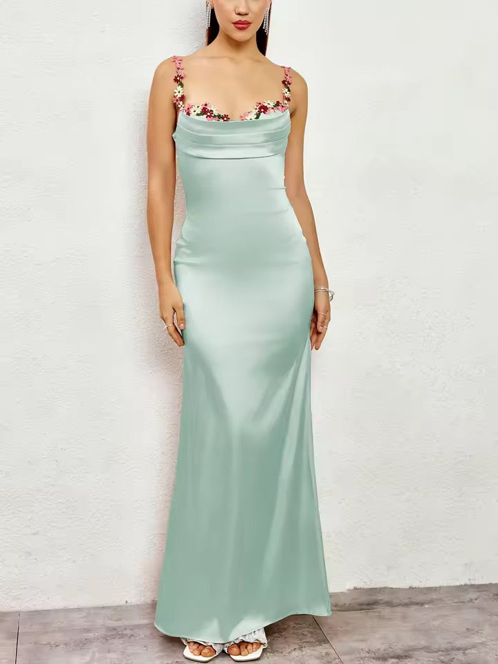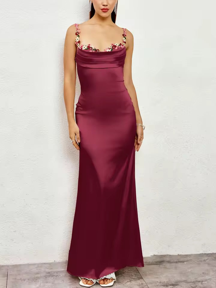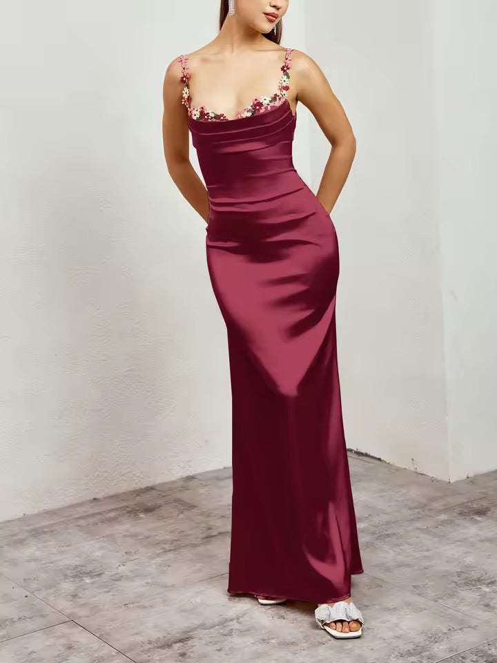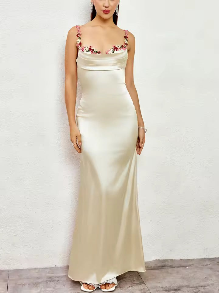 Elevate your wedding guest wardrobe with this stunning satin dress, designed to turn heads at every celebration. Delicate floral appliqués add romantic dimension and sophistication to the smooth, luxurious fabric. The fluid drape of premium satin creates an elegant silhouette that flatters and moves beautifully. Perfect for spring and summer weddings, this dress transitions seamlessly from ceremony to reception. Pair with heels and a clutch for an unforgettable look that captures the joy of the occasion.