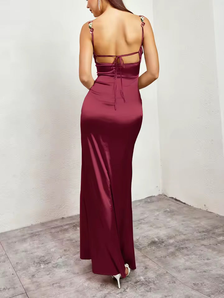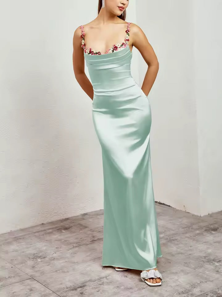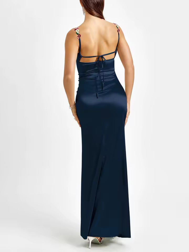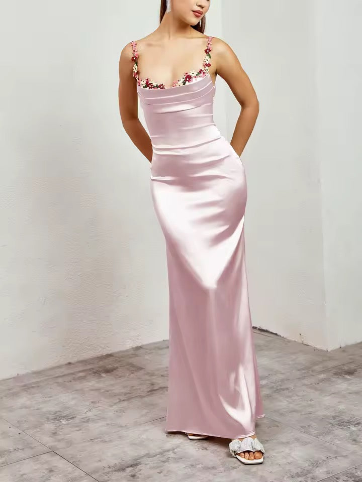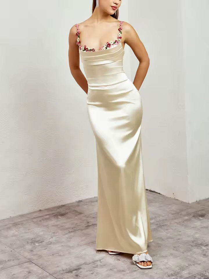 Elevate your wedding guest wardrobe with this stunning satin dress, designed to turn heads at every celebration. Delicate floral appliqués add romantic dimension and sophistication to the smooth, luxurious fabric. The fluid drape of premium satin creates an elegant silhouette that flatters and moves beautifully. Perfect for spring and summer weddings, this dress transitions seamlessly from ceremony to reception. Pair with heels and a clutch for an unforgettable look that captures the joy of the occasion.